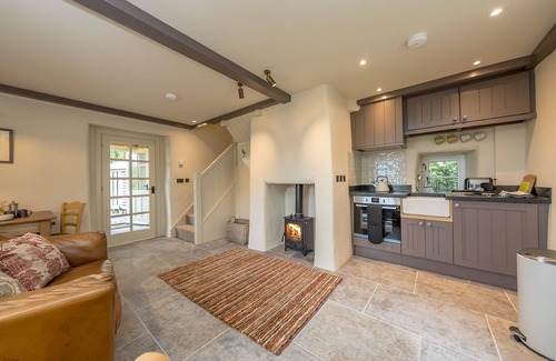 The stunning stone lodge's entrance porch opens into an open plan, one up one down layout which is bright and spacious. The ground floor space is tastefully decorated in soft and warm shades, with traditional furnishings which complement the history of the building. The floor is laid with large grey quarry tiles throughout, with a rug placed centrally in front of an inviting roaring log burner. A cosy armchair and leather sofa complete the lounge area, with a beautiful chest utilised as a side table and a Welsh dresser placed in the corner. Windows to three aspects of the room, as well as the large glass panelled door, flood the space with light and provide countryside views all around.