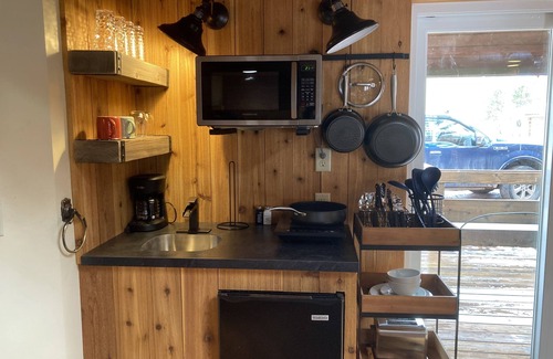 The suite faces the front of the property, to the East, with views of the fields across the county road. A kitchenette has been added which includes a sink, dining and basic cooking utensils, toaster, drip coffeemaker, microwave, induction hot plate with cooking pans, and dorm size fridge. A large flat screen TV with a Roku stick and remote are included. We use Starlink satellite internet for our WiFi, free of charge for our guests.