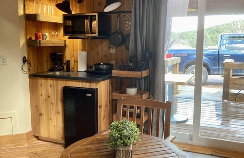 This suite is ideal for a couple, or as additional space to the adjacent Carriage House Cabin. The Carriage House Cabin is located a few steps away, to the South.