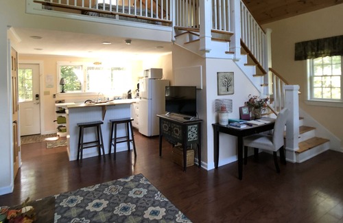 This is a recently built cottage located on 15 private, wooded acres of land on the border of Bennington and North Bennington in Southwest Vermont. Designed and constructed by the owner, care has gone into every detail of this beautiful and peaceful location. The property is quiet and secluded, but close to all of the local activities and attractions. The cottage sits on a private 1.5 acre pond with diverse wildlife, wetlands, waterfall and covered bridge. Open floor plan with a loft bedroom that overlooks the lake. It can accommodate an additional two guests with a downstairs sleeper sofa. Our home is about 200 yards away, across the pond and stream, but blocked from view most of the year by foliage.