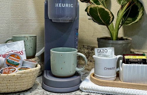 Kitchenette with microwave, Keurig hot or iced coffee maker, small refrigerator with freezer. Private bathroom with walk in shower, fluffy towels, shampoo and body wash.