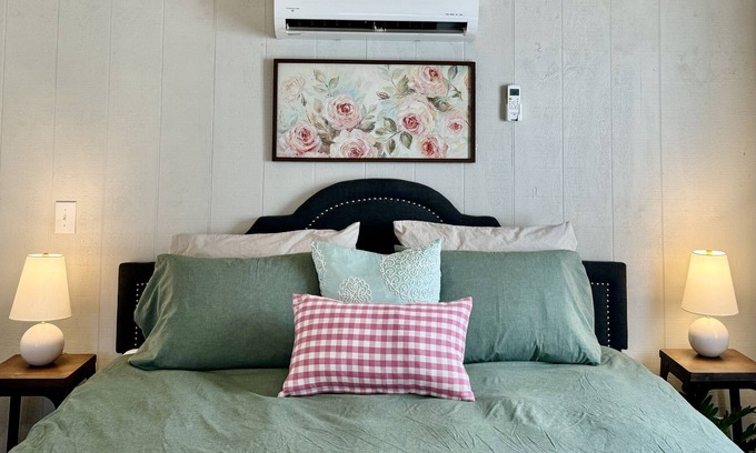 Romantic studio cottage, cozy up to the electric fireplace. Comfortable king size bed for a great nights sleep or watching your large smart tv.