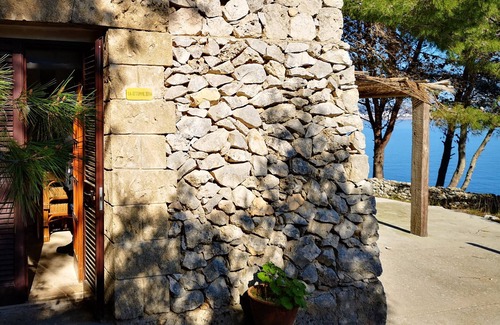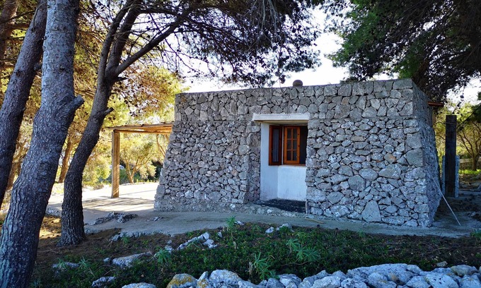 A magnificent area of 2.5 acres of pine trees with direct access to the sea, this romantic trullo, ideal for two or three people, offers spectacular views of the rocky cliffs of Castro and the Palombara cove. Immerse yourself in a corner of paradise where you can smell the fragrance of the Mediterranean and listen to seagulls and cicadas interrupted only by the sound of the waves. This house is located in an exclusive and unique estate consisting of several villas and trulli, separated by pine trees. It is known as "La Palombara" and was popular with VIPs in the seventies and eighties. At the end of 2019 we rediscovered this heavenly place and we chose to upgrade and redesign parts. It is now available for guests that are looking for a hideaway from the hustle and bustle of everyday life. In the photo gallery you will find a map of the entire grounds. A path leads from the property directly to the sea. On your way down, the views are beathtaking. Once on the rocky beach, you will find four access points for swimming, diving, snorkeling or fishing in the crystal clear water of the Lower Adriatic Sea. It might be possible to see passing dolphins. (Caution: the path and access to the sea from the rocks is not suitable for small children or people with disabilities.)The trullo, made of beautiful stone walls, has one double room with en-suite bathroom with shower (completely renovated in May 2022) and a living space with kitchen (including a dishwasher), fireplace and an additional single bed. The interior is simple but functional; there is no TV nor air conditioning, but the thick walls and pine trees mitigate the heat of the summer sun. Just outside the building, a private partly shaded terrace offers wonderful views.A barbecue and an outdoor shower complete the picture.The well-known fortified village of Castro, with its bars, cafes, restaurants and a supermarket, can be reached on foot in just ten minutes. The walk is along a charming path under the ancient Messapian walls. For those who prefer sandy beaches to rocks, the enchanting sandy beach of Porto Miggiano is 5 km away; very charming are also the coves of Porto Badisco and the long sandy beaches of Alimini, north of Otranto. Sheets, duvets and towels are not included. If you don't want to bring them with you from home, regardless of the length of your stay, you can rent them for €24 per person. Final cleaning is not included and costs €80, unless you clean yourselves before departure. Dogs and pets are allowed (max 2 dogs or pets, surcharge €100 per dog/pet). You will need to inform us in advance. We will ask you to pay a security deposit of €400 before arrival. The security deposit will be refunded within 7 days after departure, if there is no damage. Electricity costs (and thus where applicable AC, hot water, heating etc.) are NOT included in the price and will be charged based on your actual consumption. The price per kWh charged to guests was €0,52 on 14/03/2025, when this text was last updated, but as prices are fluctuating a lot, your actual price per kWh will be communicated a few days before your arrival based on the current market price.We decided not to include electricity costs in the rent in order to: a) keep our rental prices stable despite inflation and b) incentivate our guests to use electricity responsibly, helping us to reach our sustainability goals. Thank you for your understanding. ABOUT USWe're a team of holiday enthusiasts with diverse backgrounds based between Italy and Switzerland. 🇨🇭Our mission is to find the most unique holiday homes, refurbish them and make them available to people like you, who want to live the authentic Italian experience at a high (Swiss!) quality, without spending a fortune By booking this accommodation, you accept that:- We are obliged by law to verify the identity of all our guests. We will therefore ask you to upload copies of your IDs on our (secure) website to verify your identity before handing out the key code for the accommodation. Your personal data is treated in full compliance with EU data protection laws.- Also, we are obliged to sign a rental agreement with our guests (one person per group). This will be done digitally and requires just a few seconds on your side. You can find a template of the rental agreement on our website.- Parties, gatherings, events or loud music are not allowed at this property unless explicitly authorised beforehand by us in writing.- In case the local municipality charges a tourist tax, we will ask you to pay this separately to us and we will transfer it to the local authorities as required by law.