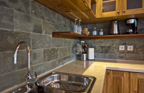 The kitchen is fully equipped for cooking while conversing easily. Prepare your meals then serve a sit-down meal at the dining table for six inside or on the terrace.