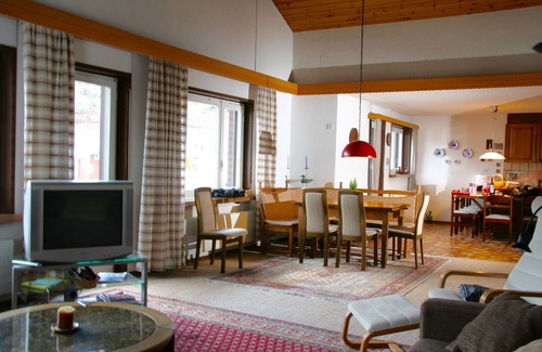 Living room with sofa, armchairs, fireplace, dining area, TV, radio, CD / DVD and wifi internet access. Kitchen with electric stove, oven, dishwasher, microwave, fridge with freezer, coffee maker, kettle, raclette and fondue set.