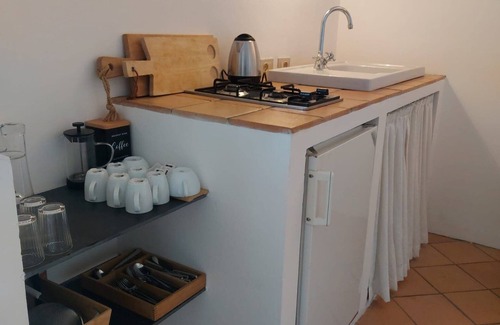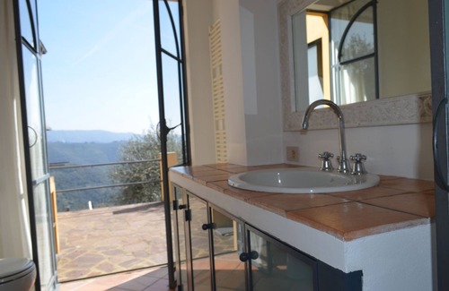 The detached country house is flooded with light, the large panoramic windows open onto the spectacular view over the olive groves to the sea. The inviting living area with the open, well-equipped kitchen has an open fireplace for cozy hours. You can be comfortable here even in the off-season. At the large dining table you can enjoy a breathtaking panorama over the valley. The tastefully furnished house offers space for 4-6 people in two bedrooms, each with a double bed and private bathroom in the main house, one on the living level and one with direct access to the pool terrace and, for that special moment, a "glamping tent" with two single beds and a small terrace about 50m from the main house. An absolute favorite place for nature lovers, those seeking peace and quiet, mountain bikers and hikers. Here you can while away the days by the pool and listen to the crickets. Below the pool area with sun loungers and lounge areas is a well-equipped outdoor kitchen with barbecue and dining area. Many dreamy nooks and seating areas invite you to relax. In Casa Bartolomeo the clocks go slower.