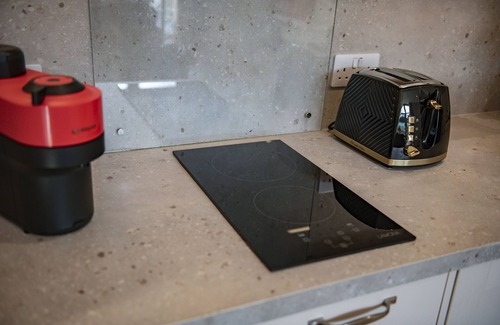 With electric oven and Induction hob, Nespresso coffee machine, microwave and fridge with ice box. (There is also access for guests to use a washing machine and dryer in the outhouse near the parking area)