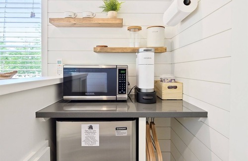 Charming Interior: The cozy interior boasts custom shiplap walls, a queen-sized bed, and a relaxing nook, providing a romantic ambiance for couples to enjoy quiet moments together.