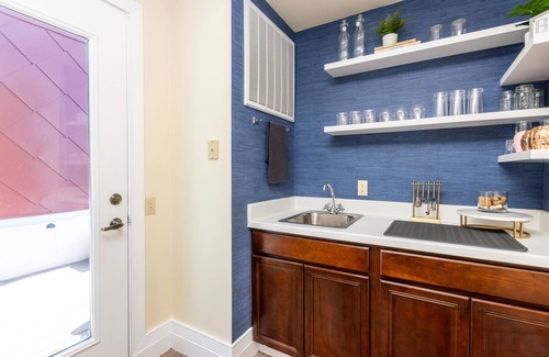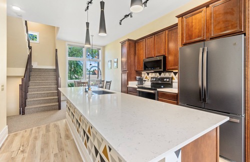 This thoughtfully designed condo provides tall ceilings, modern décor and floor to ceiling windows. The ground floor has a dedicated office area with a pull-out sofa. The main floor boasts an open floorplan featuring the dining room, kitchen, powder room and living room with a 75’’ TV. The third-floor hosts both bedrooms with full private bathrooms, walk in closets, TV's, queen beds and a primary suite balcony. Last but not least, the top floor steals the show with a wet bar and spacious rooftop patio with a firepit, comfortable seating and amazing views. Amenities include Wi-Fi, Keurig, basic toiletries, pull out sofa, board games, record player, iron, hair dryer, washer & dryer, off street parking.
