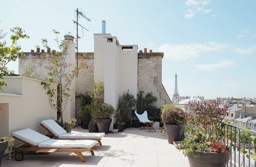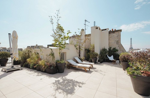 An impressive roof terrace, offering amazing views to the Arc de Triomphe and surrounding promenades. There is outdoor seating here, as well as plants and trees.