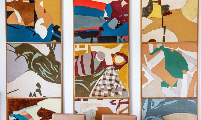 The dining room offers incredible artworks, including one large piece that covers the far wall. There is also a glass table and surrounding chairs here, as well as side tables.