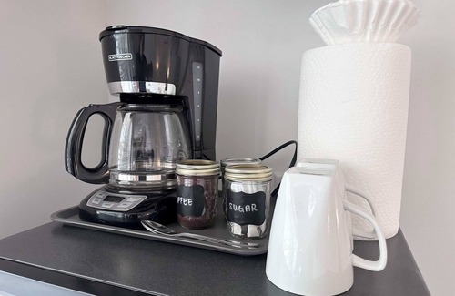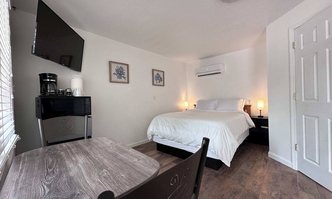 Room 10 at Inland in a Studio-Style with 1 Queen Bed. A small table and chairs provide the perfect laptop work space. This room has a microwave oven. The room also has a coffee pot, coffee, creamer and sugar are included. A small refrigerator/freezer is available for use. A shower completes this room nicely. Perfect for limited or long-term rental.