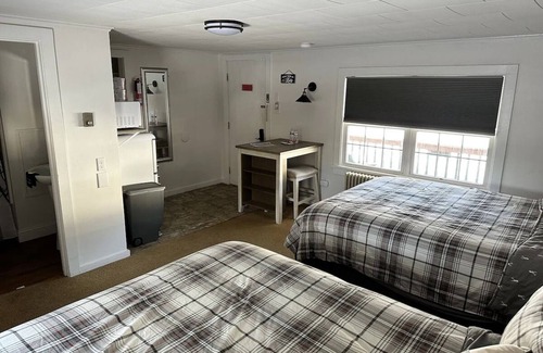A room with two queen beds a place to sit and eat, with a fridge microwave, toaster and a coffee pot. Walking distance to one of our best restaurants and a short drive from town and our beautiful town beach.