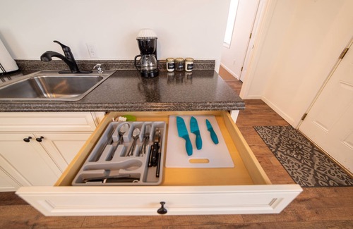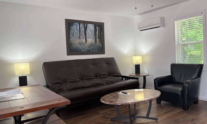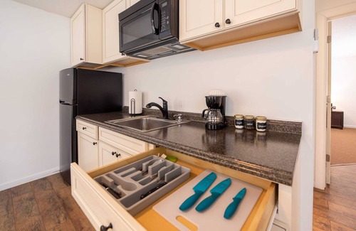 This is a spacious Suite with 1 Bedroom containing a Queen Bed. Additional sleeping available with a Queen-Size sofa bed. Small Kitchen Area with Full-Size Refrigerator, Kitchen Sink, Microwave, Dishes, Coffee Maker (Coffee, Creamer and Sugar included). A Kitchen table with bench seating and an additional chair and end table provide a cozy, relaxing space.