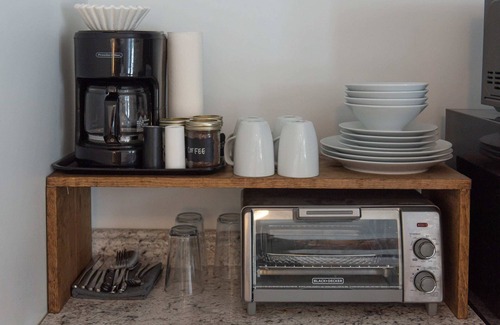 Room 2 at Inland in a Studio-Style with 2 Queen Beds. A small table and chairs provide the perfect laptop work space. This room has a hot plate, microwave oven and toaster oven for limited cooking. Cookware, dishes, silverware and some limited utensils are provided. The room also has a coffee pot, coffee, creamer and sugar are included. A small refrigerator/freezer is available for use. A tub/shower combo complete this room nicely. Perfect for limited or long-term rental.
