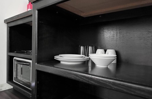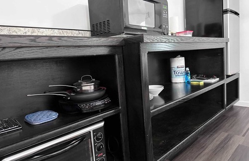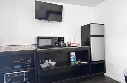 Room 5 at Inland in a Studio-Style with 1 Queen Beds. A small table and chairs provide the perfect laptop work space. This room has a hot plate, microwave oven and toaster oven for limited cooking. Cookware, dishes, silverware and some limited utensils are provided. The room also has a coffee pot, coffee, creamer and sugar are included. A small refrigerator/freezer is available for use. A tub/shower combo complete this room nicely. Perfect for limited or long-term rental.