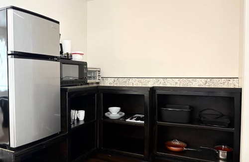 Room 8 at Inland in a Studio-Style with 1 King Bed. A small table and chairs provide the perfect laptop work space. This room has a hot plate, microwave oven and toaster oven for limited cooking. Cookware, dishes, silverware and some limited utensils are provided. The room also has a coffee pot, coffee, creamer and sugar are included. A small refrigerator/freezer is available for use. A tub/shower combo completes this room nicely. Perfect for limited or long-term rental.