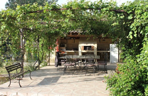 Around the house, 3000m2 of fenced land, under a flowered pergola, table d'hôtes, pizza oven, barbecue, possibility of preparing meals yourself, breakfasts, closed outdoor kitchen, hotplates, fridge, microwave , kitchen utensils, dishes, for use, participation in the "" 5 € "" costs per day, per room.