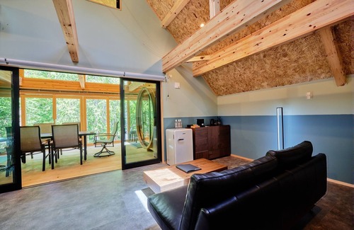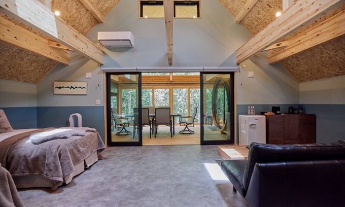 The private cottages designed in the image of birthstones all come with a barrel sauna jacuzzi electric theater and BBQ grill Up to six Simmons beds and two sets of futons can be provided in the loft In addition the rooms are equipped with bathroom facilities and amenities equivalent to those of a luxury hotel The view from the terrace side is of the forest and the private space where you can relax in the greenery is truly luxurious
