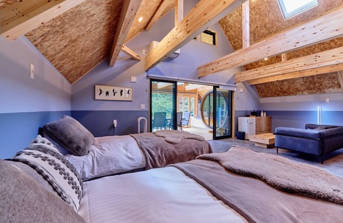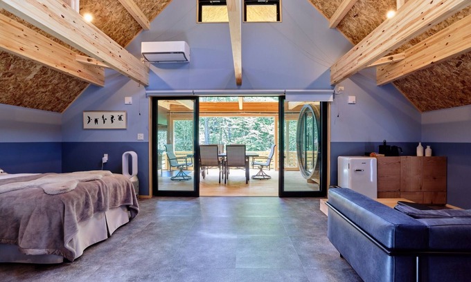 The private cottages designed in the image of birthstones all come with a barrel sauna jacuzzi electric theater and BBQ grill Up to six Simmons beds and two sets of futons can be provided in the loft In addition the rooms are equipped with bathroom facilities and amenities equivalent to those of a luxury hotel The view from the terrace side is of the forest and the private space where you can relax in the greenery is truly luxurious