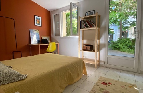 The room is a 16m² outbuilding at the end of our garden, in a quiet location, in the central and lively Camas district.