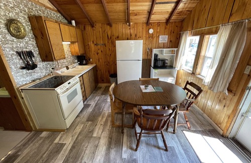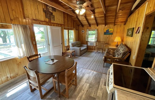 This cabin is located at Green Valley Resort on Seventh Crow Wing Lake. It has a lake view, open rafter ceiling, separate kitchen and living areas with a sofa and futon, tub/shower combo, window A/C and ceiling fans. We have an on-site lodge with books, games, and snacks; dock space for your boat; and boats for rent too. Come enjoy beautiful sunsets, great fishing, and relaxing in nature at our family-friendly fishing resort! We hope to see you soon!