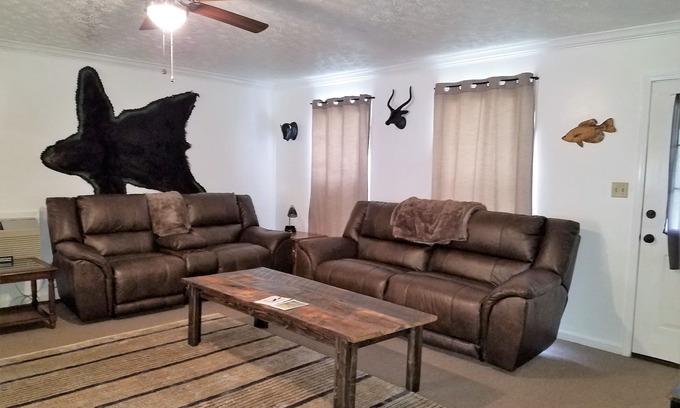 Remote cabin on ten acres, plenty of room for outdoor activities, gatherings, nature is abundant, deer, turkey can be seen. Two bedrooms, one bath, spacious living room with reclining sofas, large TV, fooseball table, kitchen complete with smooth top range, refrigerator, microwave, coffee maker and toaster. Plenty of room for 2 trucks and boats, four wheelers, tent camping, motorcycles, outdoor fun. . 1 mile from the Jonathan Creek bridge on beautiful Kentucky Lake, minutes from Land Between the Lakes, Wranglers Camp for horseback riding, hiking, Turkey Bay for four wheeling, something for everyone.
