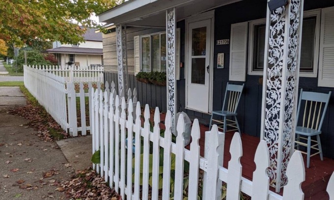 The cottage sits on a corner lot that is lined by a white picket fence. Includes both a grill and fire pit, bikes and kayaks and has everything needed for a relaxing stay.