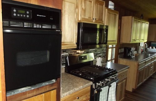 The Roosevelt Cabin is the largest cabin onsite with a full kitchen that includes cookware, dinnerware, flatware and coffee pot, a dining room, spacious living room with Fireplace and bar, a large screened porch with seating overlooking the White River, an outdoor charcoal grill with picnic tables. The cabin has two bedrooms with two queen beds in first bedroom and two queen beds and one double bed in the second bedroom, all bed linens are provided including pillows. There are two and half baths with towels and bath soap. Direct TV and WiFi are also provided.
