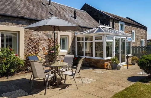 Step into the hallway of this charming, single-storey converted steading, where you’ll find a place to store your muddy walking boots and coats. Make your way to the inviting lounge, furnished with your comfort in mind. After a day of sightseeing, relax on the comfortable sofa and enjoy a movie on the Smart TV. Adjacent, you’ll find the petite but charming kitchen, which is perfectly appointed for your convenience. Prepare a tasty selection of dishes for your group, which can then be served at the dining table in the pretty conservatory. On sunny evenings, open the French doors and enjoy a relaxing amble in the manicured garden. Further along the hallway, you’ll find two well-appointed double bedrooms, both decorated with tranquil, neutral colours. One bedroom boasts a Smart TV for lazy mornings under the covers, while both rooms are served by the well-appointed shower room with a shower and WC.