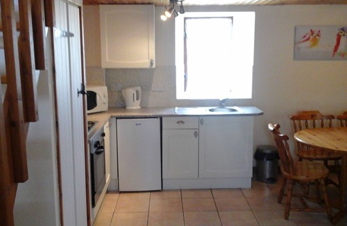 The ground floor is open plan with a lounge and dining area, with a suite and dining table and chairs. The corner kitchen has just been refitted and has a electric cooker and gashob, a fridge and a microwave oven.