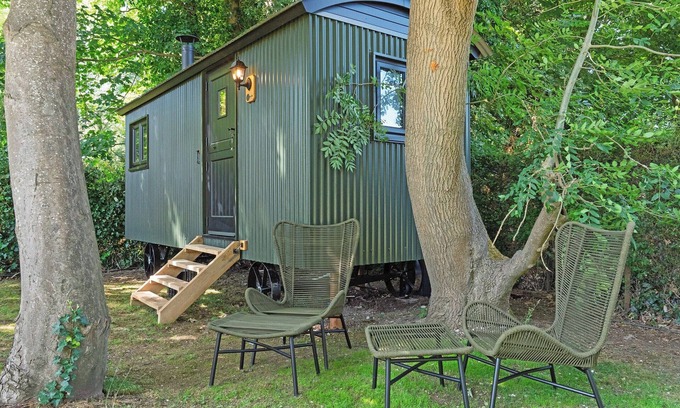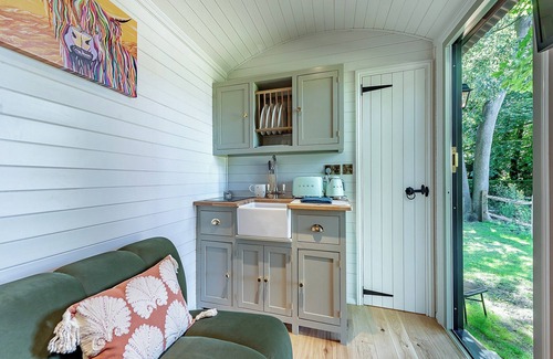 Shower Room: Cubicle Shower, Heated Towel Rail, Toilet. Electricity, bed linen, towels and Wi-Fi included. Initial fuel for wood burner included. Welcome pack. Front garden with sitting out area and garden furniture. Private parking for 1 car. No smoking.. Nestled in the serene heart of Banstead, this charming shepherd’s hut offers a perfect retreat for couples seeking tranquillity and convenience. The hut is nestled between trees. Located just a short stroll away from the bustling High Street, guests can immerse themselves in the quaint charm of this historic village while enjoying easy access to London and the surrounding Surrey Hills Area of Outstanding Natural Beauty.