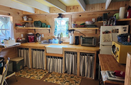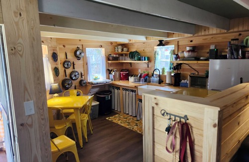 The cabin has a mini-split heat pump and AC, WIFI, 32" Roku TV, full bathroom with tub and shower, computer work area, and a large couch. The eat-in kitchen has a table for 4, a microwave, counter top oven w/air fryer, refrigerator w/freezer, 2 burner stove top, and a pod coffee maker. Cookware and dishes are supplied.
