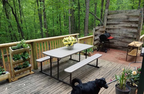 Set on 3.5 private wooded acres, Rose's Cabin is a cozy, work-in-progress, 600' square open floor plan rustic cabin with 1 queen bed, and 1 full bed in its own nook. Enjoy the peace and quiet of the woods during your stay as well as exploring the nearby parks, hills, waterfalls, and lakes. The cabin has a large multi-level deck, part of which is covered, with a picnic table, grill, fire pit, bench swing, and several relaxing chairs. The deck is surrounded with a 4' tall railing with gates at the exits so dogs can't wander out. There is even a fenced in area of the yard behind the porch.