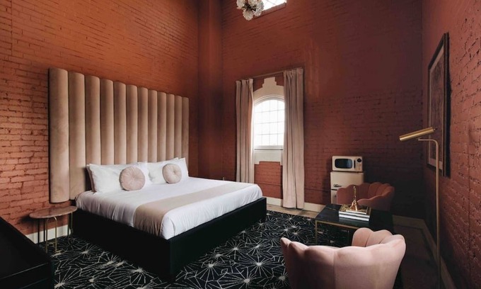 Immerse yourself in the era of Art Deco design when you settle into our Rosewood Suite. Working with the existing architectural features and structural elements, this rooms is truly an immersive experience. It has been transformed adding all the touches modern travelers enjoy while paying homage to the history of the building. Complete with a cozy sitting area, velvet headboard, King sized organic memory foam mattress, SmartTV, coffee station, mini-fridge and microwave.