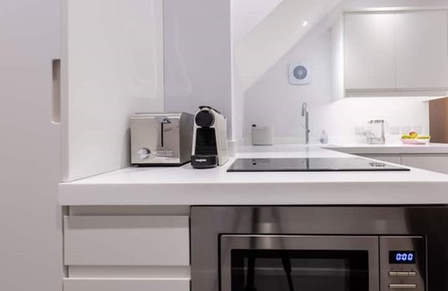 The apartment is split on two levels, the ground floor comprises the entrance lobby, bathroom and kitchen with the upstairs being an open-plan living room and bedroom.