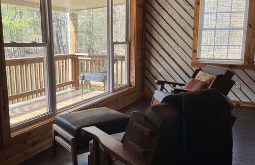 Our cabin features a private bedroom downstairs with a queen size bed and an upstairs loft with 3 separate sleeping areas. A full bed area with it's own balcony, an area with 2 twin sized beds and another area with 2 queen sized beds. Big enough for the whole family! The large great room has plenty of things to keep you busy should you decide to stay inside. Or find many outdoor activities on site such as hiking and fishing in the private pond, or take a short drive from the cabin for all your outdoor experiences.