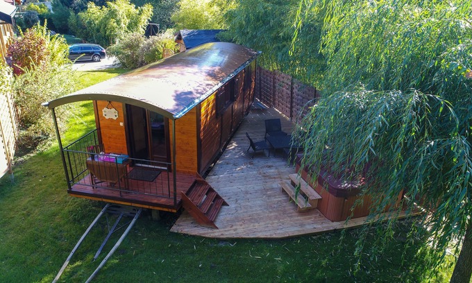 Authentic wooden caravan, air-conditioned, with all modern comforts.