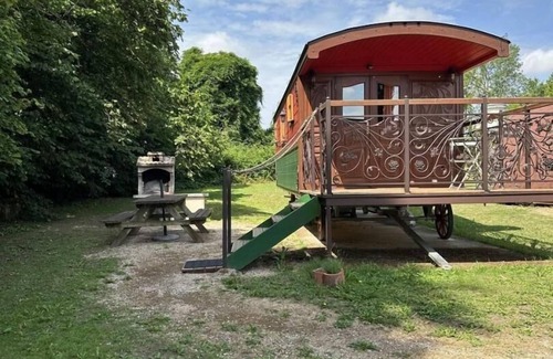 Near 16th century fortified house, in peaceful leafy setting. 'Rhapsodie' gypsy caravan (23 sq.m.): kitchen area, lounge area (80x190cm bench bed + pull-out bed below), bedroom (160x200cm bed over fitted cupboards), small shower room, separate WC. Terrace (7 sq.m.) perfect for relaxing and enjoying the peaceful setting. Access to owners' covered swimming pool (under certain conditions). Use of separate caravan with laundry space (washing machine shared by both caravans). Electric heating with warm/cool air system. The perfect 'get away from it all' holiday.