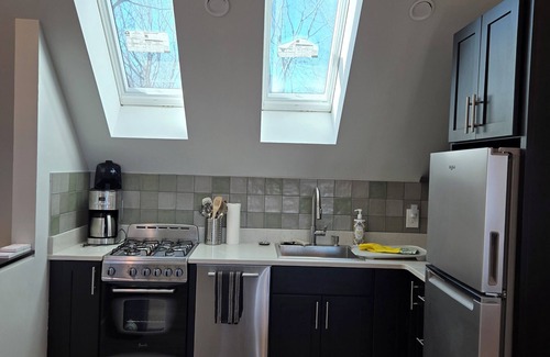 The apartment is on the second floor of a newly constructed home on a dead-end road. It has a separate entrance with its own balcony. After ascending the stairs, you enter into an open kitchen, dining, living area. The glass sliding doors provide a beautiful view of the Atlantic Ocean and a seating area on the terrace. There are many operable skylights which help with ventilation and provide lots of natural light.