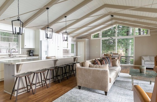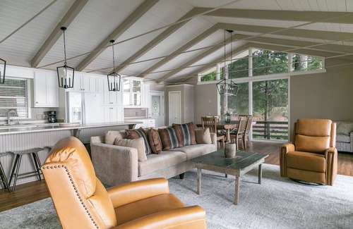 Step inside and you'll be greeted by a spacious, open-concept living area with vaulted ceilings, abundant natural light, and stylish décor. The fully stocked kitchen has everything you need to whip up meals for your group. The large dining table and generous living room with plush seating create a welcoming space for everyone to gather, play games, and enjoy the lake views.