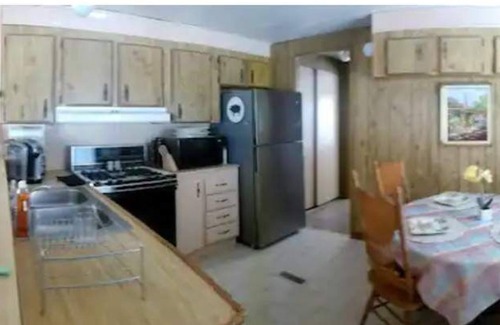 This 2 bedroom 2 bath modular house is adjacent to the Labyrinth. It sits at the front of the 20 acre ranch. The shared lake is close by and available for fishing and swimming or the use of one of the pedal boats. You will have the use of a golf cart and can visit the tortoise preserve and the lake easily. The ranch is completely fenced and gated, and you have a clicker to the gate.