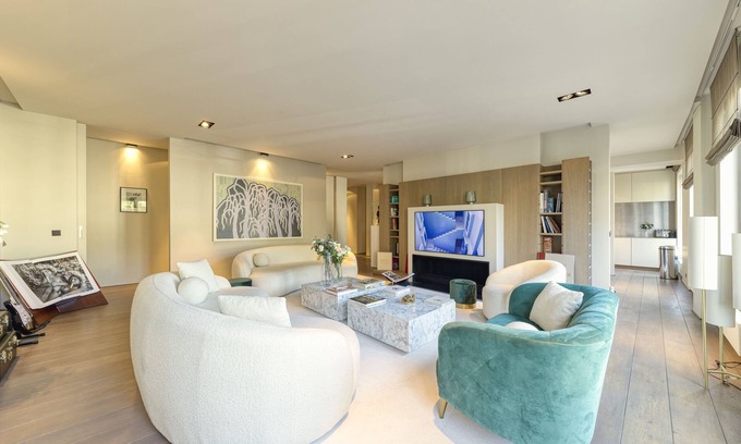 This unique accommodation is close to all sites and amenities. Located in a historic building, dating from 1827, on the Place du Grand Sablon, the luxurious apartment is on the entire 2nd floor and occupies 300m2. Only the vaulted cellars of the old palace which was erected on its premises in the 16th century are still existing. Each room overlooking the Place du Sablon offers exceptional views of the square and its church. A private elevator takes you directly to your personal floor. It includes: 4 large bedrooms, 3 bathrooms, a toilet, a dressing room, a large fully equipped kitchen, a laundry room, a dining room for 12 people, a huge living room, and incredible views of the Grand Sablon square and Brussels. The living room features 3 large sofas, a comfortable chair, a work desk, a guitar, a fireplace, board games, multiple art books, a 75-inch TV, a SONOS sound system, and a minibar. All bedrooms are equipped with 5-star hotel mattresses and bedding as well as large storage spaces: • A queen-size bedroom with a view of the Sablon church and a shared marble bathroom with the next bedroom. • A king-size bedroom with a view of the Palace of Justice and a shared marble bathroom with the previous bedroom. • A king-size bedroom with a view of the Palace of Justice and its own marble bathroom. • A queen-size bedroom with its own marble bathroom. Thanks to your private access code elevator, you will enjoy a totally personal floor of 300m2. Place du Grand-Sablon is one of the most elegant places in Brussels. It is lined with old facades, antique shops, art galleries, numerous cafes, famous restaurants and the best chocolatiers. Its atmosphere will delight you! During the end-of-year celebrations, Christmas decorations will bring you into a festive atmosphere. Every Thursday takes place a gourmet market that will delight your taste buds!