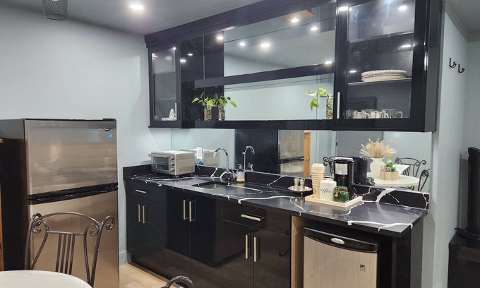 Mini-Kitchen: Perfect for making snacks and light meals. It includes a Refrigerator, Microwave, Induction stove, Toaster, and coffee maker, ( Not 4 burner cooktop ). ( if you do not want to cook this time?- We got you. We have leads for food delivery, Take out restaurants, Uber Eats, etc)Dining table and chairs.