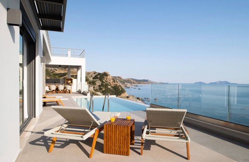 It was built and finished to a high standard and is traditionally designed, throughout, with much attention to detail. Outside there are a private yard and balcony, overlooking the Lybian Sea with a BBQ and a dining area, to enjoy alfresco dining. The magnificent outdoor swimming pool, which combined with the perfect sea view, will keep you there the whole day. The luxury combined with the ultimate privacy offers an unforgettable stay and a unique experience.