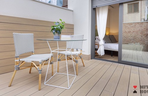The living room is very cosy and is composed of a dining area with the kitchen and a rest area with two comfortable individual sofa beds and a SmartTV that will allow you to connect your Netflix, HBO, Spotify and other accounts. The living room is also very bright thanks to its wide wall-to-wall window. The modern kitchen has everything necessary to play with culinary fantasy. The bedroom space is very well used, it has a comfortable double bed, a built-in wardrobe and direct access to the splendid and spacious terrace where you can enjoy the good weather of Madrid.