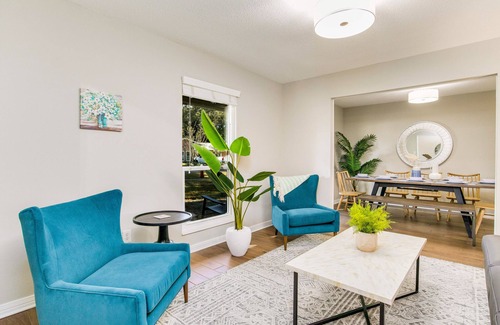 The privacy-fenced backyard features a cozy patio equipped with a table, chairs, and an electric grill, ideal for al fresco dining. Inside, the fully stocked kitchen is ready for all your culinary needs, complete with dishes, pots and pans, a coffee maker, and a crockpot. For eco-conscious travelers, the EV charger (J1772) is available for your convenience. Additionally, a washer and dryer are located in the garage area, making longer stays even more comfortable.