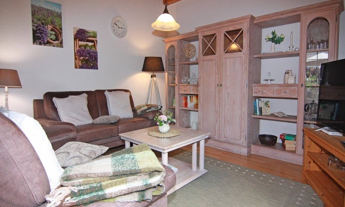 This two-story apartment in Kritzmow, on the quiet outskirts of Rostock, offers a relaxing retreat for families or small groups. The ground floor features a spacious living room with direct access to a sunny terrace and orchard, a separate kitchen, and a guest toilet. Upstairs, guests will find a cozy bedroom, a bathroom with a bathtub and shower enclosure, and a gallery with a sofa bed, ideal for a child or additional guest.