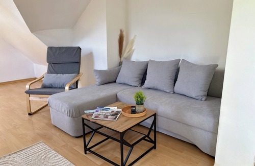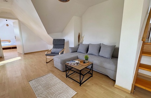 Helle, modern möblierte Wohnung mit Platz für bis zu 5 Personen (Doppelbett, 2 Einzelbetten, Schlafsofa). Voll ausgestattete Küche, Smart-TV, Bad mit Dusche & Wanne, frische Handtücher und Bettwäsche inklusive. Ideal für Geschäftsreisende oder Eventbesucher. Digitale Anreise jederzeit möglich – ruhig wohnen, komfortabel ausgestattet.