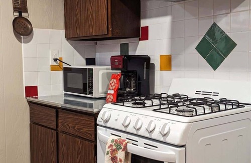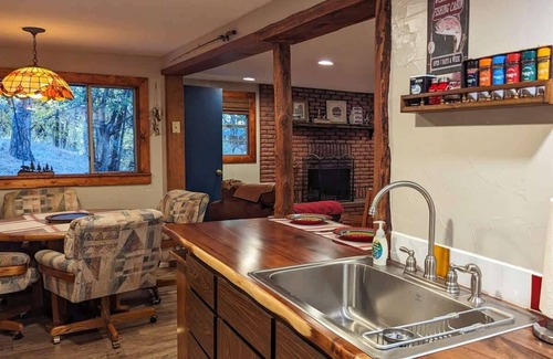 The kitchen has a vintage vibe with a dining table that almost didn't stay after the remodel. The dining chairs are way too comfy though! We couldn't get rid of them! Enjoy dinner then games around the table. You'll see what we mean! This cabin is super comfortable!